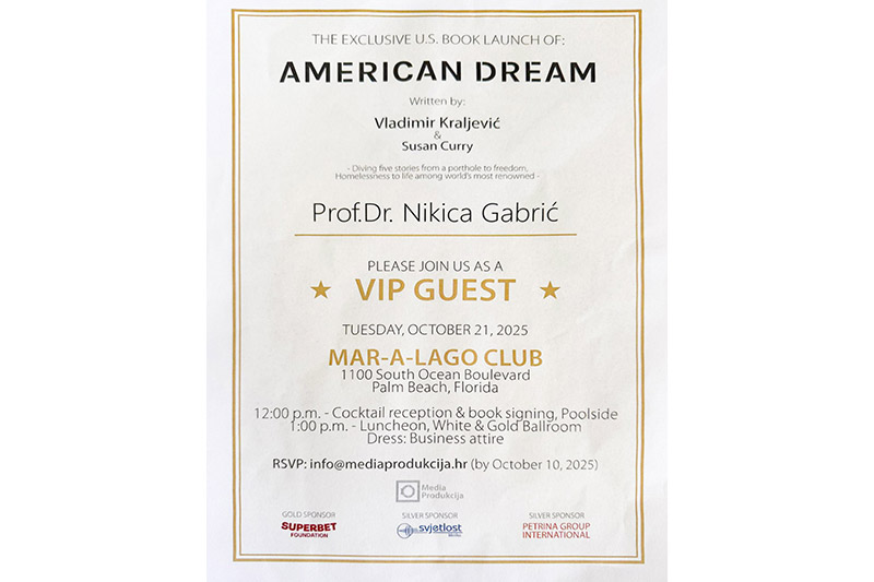 Prof. dr. sc. Nikica Gabrić, ugleden oftalmolog in ustanovitelj Specialne bolnišnice Svjetlost, ter dr. Krešimir Gabrić sta bila častna gosta na ekskluzivni predstavitvi knjige „American Dream“ avtorjev Vladimirja Kraljevića in Susan Curry, ki je potekala v prestižnem klubu Mar-a-Lago v Palm Beachu na Floridi.