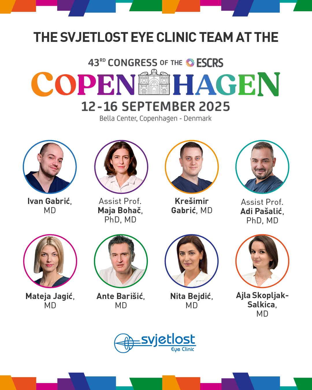 Na ovogodišnjem kongresu, tim istaknutih oftalmologa iz Klinike Svjetlost: dr. Ivan Gabrić, doc. dr. sc. Maja Bohač, dr. Krešimir Gabrić, dr. Ante Barišić, doc. dr. sc. Adi Pašalić, dr. Mateja Jagić, dr. Nita Bejdić i dr. Ajla Skopljak Salkica predstavit će najnovija dostignuća i inovacije u području refraktivne kirurgije.
